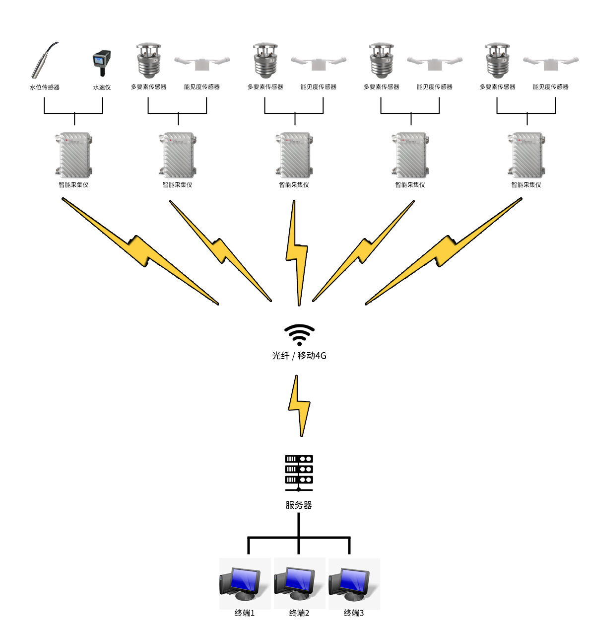 水文氣象預警在線監(jiān)測系統(tǒng)由多要素氣象傳感器、能見度傳感器、水位儀、水速儀、氣象數(shù)據(jù)采集儀、供電系統(tǒng)、戶外防護箱、安裝支架和避雷裝置等部分構成。系統(tǒng)集了新型傳感技術、電磁兼容技術、數(shù)據(jù)處理與信號分析技術、低功耗設計技術、網(wǎng)絡通訊技術等,實現(xiàn)了對氣溫、濕度、氣壓、風速、風向、雨量、能見度、水位、水流速等信息的實時監(jiān)測,并將這些環(huán)境信息可通過4G/光纖等通訊傳輸方式傳輸?shù)?.分析系統(tǒng)(后臺)中,..分析系統(tǒng)可將收集到的信息進行存儲、統(tǒng)計及分析,以報表、曲線、統(tǒng)計圖等方式顯示給用戶。